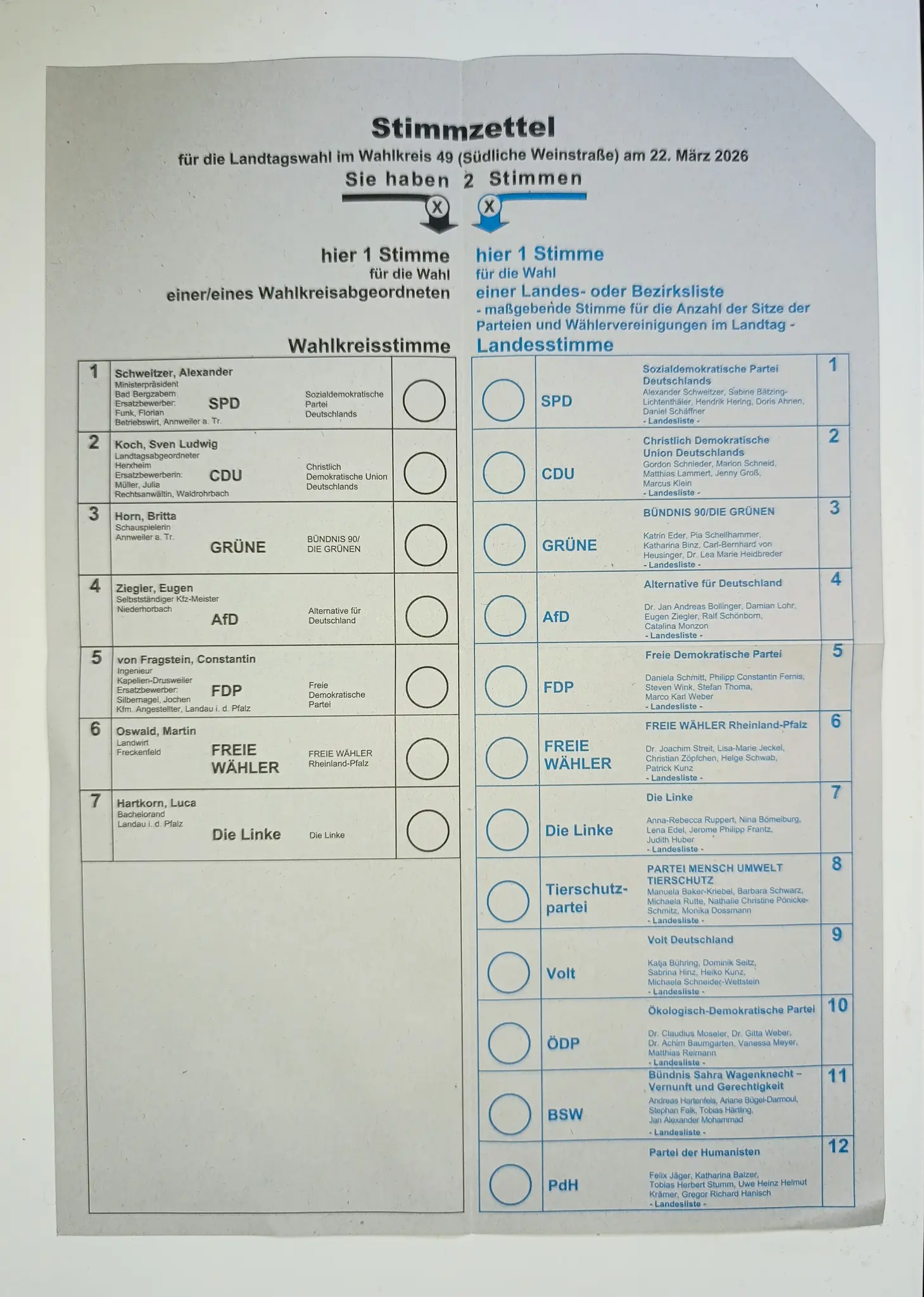 Musterstimmzettel Landtagswahl Rheinland-Pfalz 2026 für den Wahlkreis 50 Landau in der Pfalz