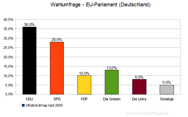 Ich glaube auch, dass Freie Wähler und Piratenpartei.de zusammen schon mehr als 5% bekommen werden. Auch Die Linke schätze ich eher etwas höher ein. Die 36% für CDU/CSU sind ohne Einsatz von Wahlcomputern wohl nur Wunschträume.
