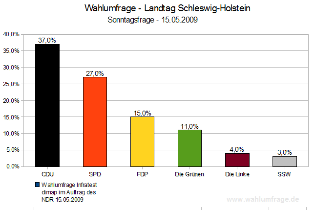 | Quelle: | Wahlumfrage Infratest dimap im Auftrag des NDR 15.05.2009 |
