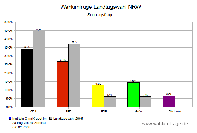 Wahlumfrage Landtagswahl Nordrhein-Westfalen (NRW) Von AF | 27. Februar 2009 0 KommentareSonntagsfrage zur Landtagswahl NRW 26.02.2009 - www.wahlumfrage.deIn Zahlen:Quelle:Instituts OmniQuest im Auftrag von NGZonline (26.02.2008)Landtagswahl 2005CDU34,3%44,6%SPD26,8%37,1%FDP12,8%6,2%Grüne14,5%6,2%Die Linke6,6% Klicke, um auf X zu teilen (Wird in neuem Fenster geöffnet) X Klick, um auf Facebook zu teilen (Wird in neuem Fenster geöffnet) Facebook Klick, um auf LinkedIn zu teilen (Wird in neuem Fenster geöffnet) LinkedIn Klick, um auf Tumblr zu teilen (Wird in neuem Fenster geöffnet) Tumblr Klicken, um auf Telegram zu teilen (Wird in neuem Fenster geöffnet) Telegram Klicken, um auf WhatsApp zu teilen (Wird in neuem Fenster geöffnet) WhatsApp